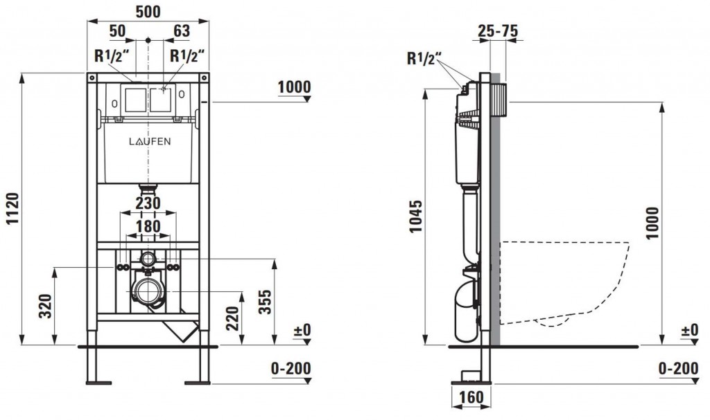 - inštalačné rozmery: 500 x 1120-1320 mm