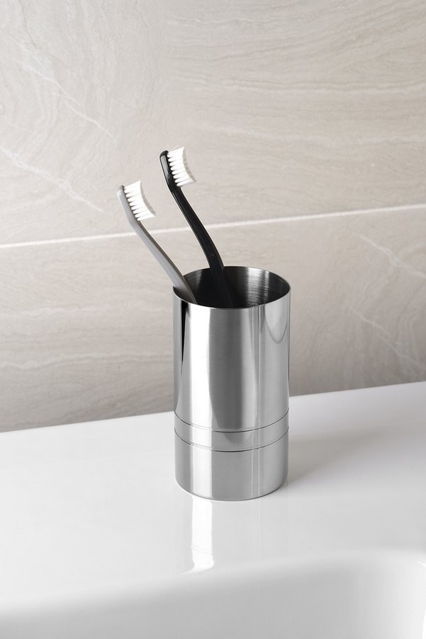 Řada koupelnových doplňků na postavení z lesklé nerezové oceli v decentním designu.
