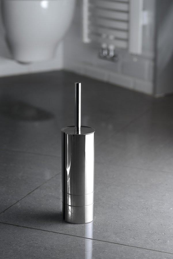 Řada koupelnových doplňků na postavení z lesklé nerezové oceli v decentním designu.