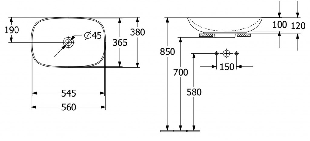 Umývadlo na postavenie na dosku alebo kúpeľňovú skrinku