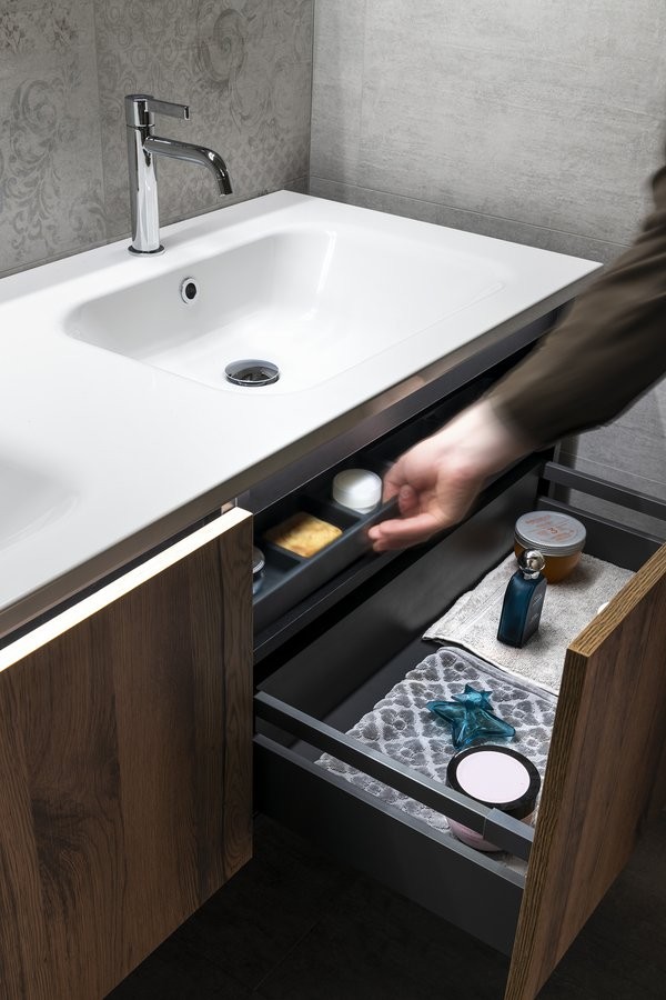 Nábytok je vybavený pojazdy zásuviek s pomalým dojazdom a systémom automatického dovretí zásuviek. Už žiadne hlučné zatváranie.