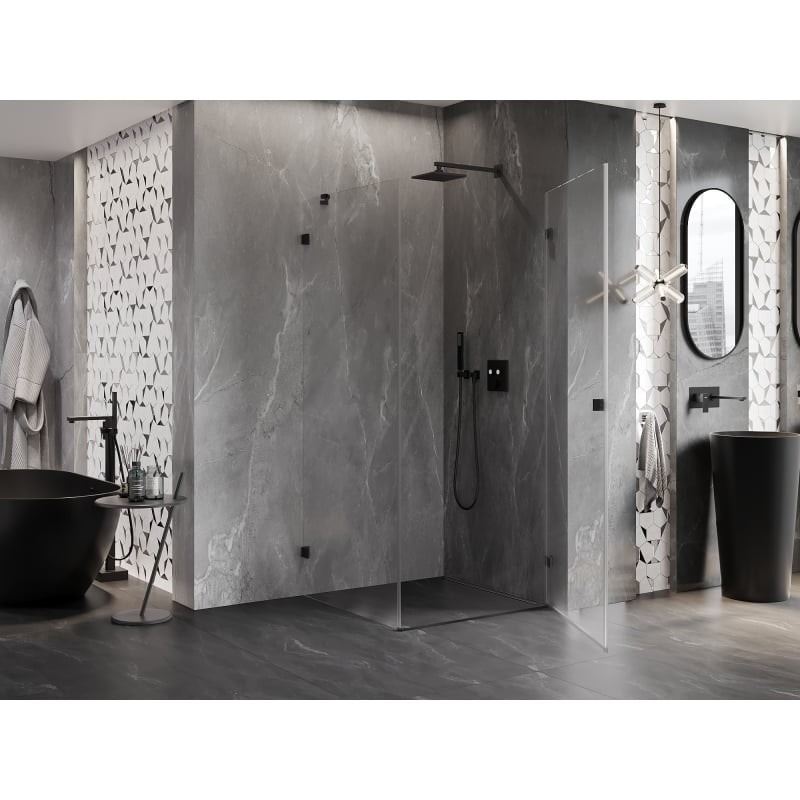 Špecifikácia produktu: Rozmer: 90x90 cm (pravé dvere 90 cm, stena 90 cm) Výška: 200 cm Strana montáže: Pravá Vchod: Dvere s otočnými pántami Farba skla: Priehľadná Povrchová úprava: Čierna Profil: Hliník Stabilizátor v tvare L: Nerezová oceľ Typ skla: Tvrd mm Obliečka na jednoduché čistenie Možnosť nastavenia šírky Dva montážne systémy: - s profilom, ktorý umožňuje vyrovnanie nerovností steny - bez profilu v prípade dokonale rovných stien Možnosť montáže na sprchovú vaničku alebo obklady Mechanizmus na zdvíhanie a spúšťanie dverí Mosadzné svorky v jednej rovine so sklenenou tabuľou Magnetický prúžok a dverí