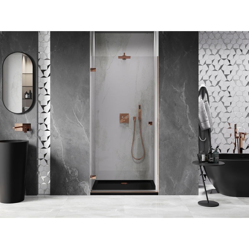 Specifikace produktu: Rozměr: 65x200 cm Strana montáže: Levá Vchod: Výklopný Barva skla: Průhledná Povrchová úprava: Růžové zlato Profil: Hliník Typ skla: Tvrzené Tloušťka skla: 6 mm Povrchová úprava pro snadné čištění Nastavitelná šířka Dva montážní systémy: - S profilem, který umožňuje vyrovnání nerovností stěn - Bez profilu pro dokonale rovné stěny Možnost montáže na sprchovou vaničku nebo obklady Mechanismus pro zvedání a spouštění dveří Mosazné svorky v jedné rovině se skleněnou tabulí Magnetický proužek a elastomerové těsnění pro odtok vody Hliníkový práh těsnění dveří