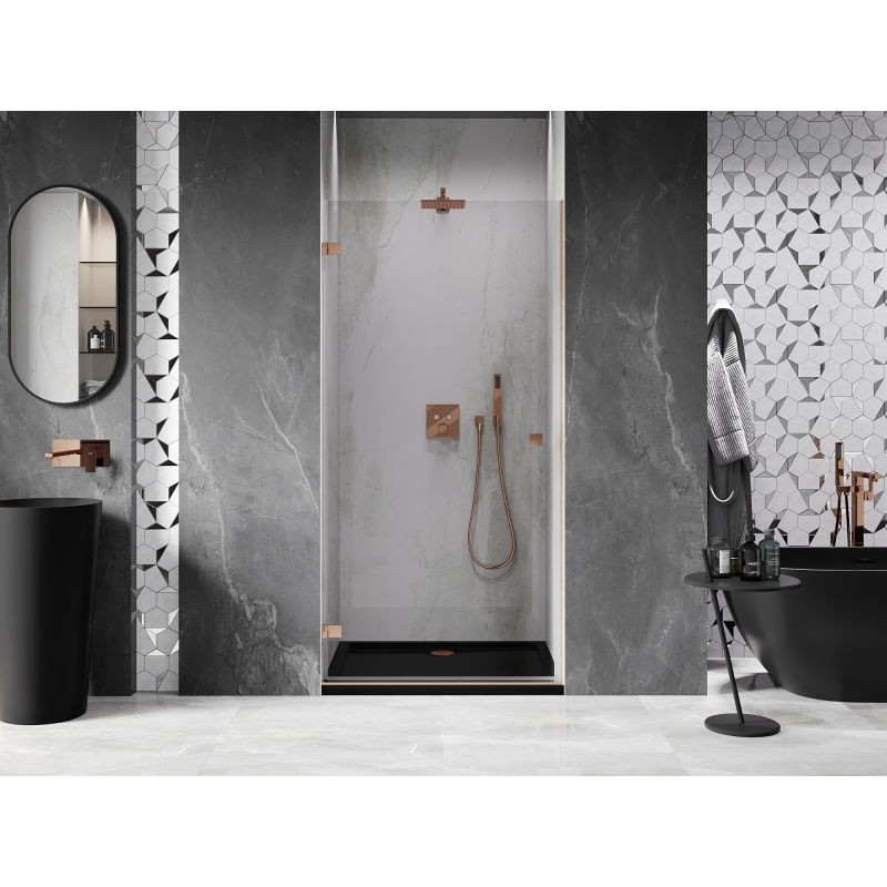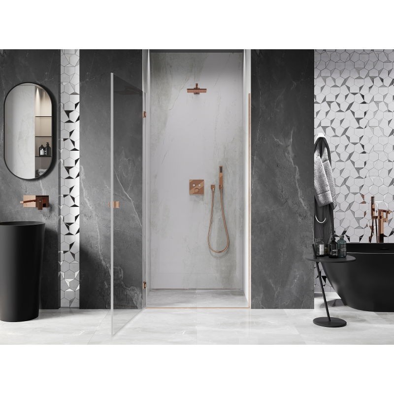 Specifikace produktu: Rozměr: 95x200 cm Strana montáže: Levá Vchod: Výklopný Barva skla: Průhledná Povrchová úprava: Kartáčovaná měď Profil: Hliník Typ skla: Tvrzené Tloušťka skla: 6 mm Povrchová úprava pro snadné čištění Možnost nastavení šířky Dva montážní systémy: - S profilem, který umožňuje vyrovnání nerovností stěn - Bez profilu pro dokonale rovné stěny Možnost montáže na sprchovou vaničku nebo obklady Mechanismus pro zvedání a spouštění dveří Mosazné svorky v jedné rovině se skleněnou tabulí Magnetický proužek a elastomerové těsnění pro odvod vody Hliníkový práh těsnění dveří