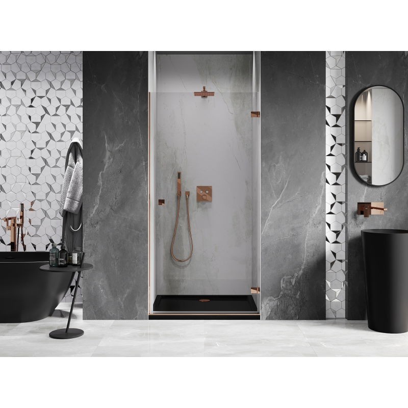 Specifikace produktu: Rozměr: 65x200 cm Strana montáže: Pravá Vchod: Otevíravý Barva skla: Průhledná Povrchová úprava: Růžové zlato Profil: Hliník Typ skla: Tvrzené Tloušťka skla: 6 mm Povrchová úprava pro snadné čištění Možnost nastavení šířky Dva montážní systémy: - S profilem, který umožňuje vyrovnání nerovností stěn - Bez profilu pro dokonale rovné stěny Možnost montáže na sprchovou vaničku nebo obklady Mechanismus pro zvedání a spouštění dveří Mosazné svorky v jedné rovině se skleněnou tabulí Magnetický proužek a elastomerové těsnění pro odtok vody Hliníkový práh těsnění dveří