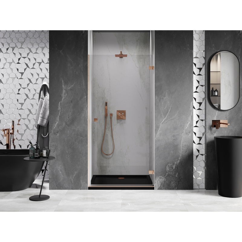 Specifikace produktu: Rozměr: 70x200 cm Strana montáže: Pravá Vchod: Otevíravý Barva skla: Průhledná Povrchová úprava: Kartáčovaná měď Profil: Hliník Typ skla: Tvrzené Tloušťka skla: 6 mm Povrchová úprava pro snadné čištění Možnost nastavení šířky Dva montážní systémy: - S profilem, který umožňuje vyrovnání nerovností stěn - Bez profilu pro dokonale rovné stěny Možnost montáže na sprchovou vaničku nebo obklady Mechanismus pro zvedání a spouštění dveří Mosazné svorky v jedné rovině se skleněnou tabulí Magnetický proužek a elastomerové těsnění pro odtok vody Hliníkový práh těsnění dveří