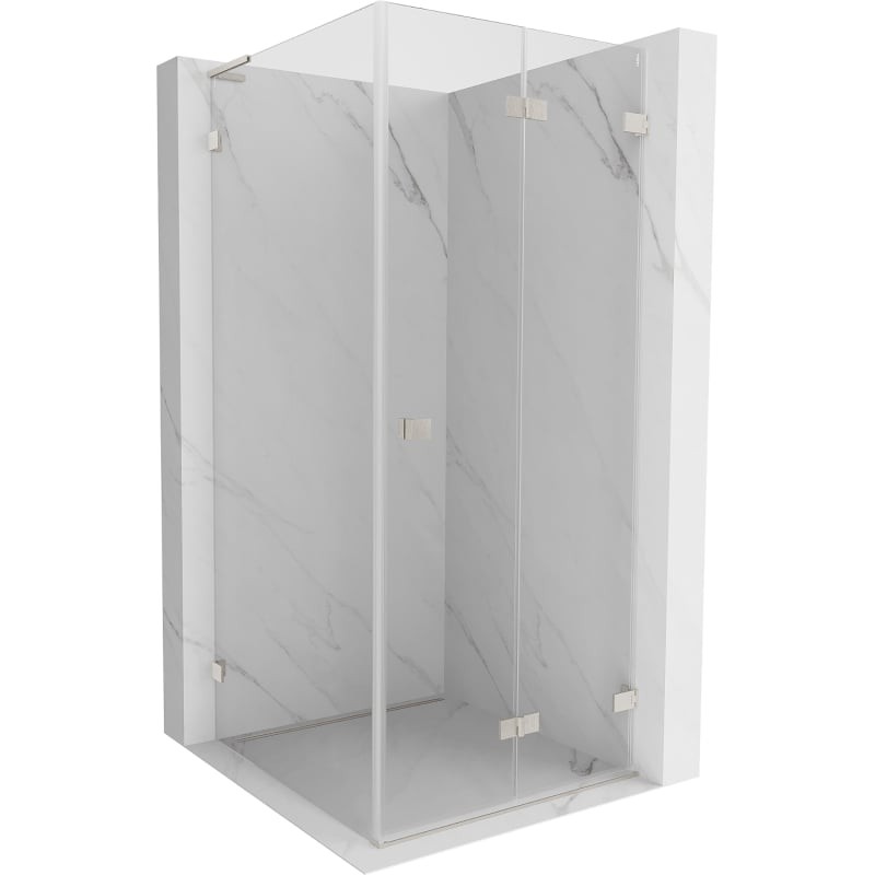 Špecifikácia produktu: Rozmer: 90x90 cm (pravé dvere 90 cm, stena 90 cm) Výška: 200 cm Strana montáže: Pravá Vchod: Skladacie dvere Farba skla: Priehľadná Povrchová úprava: Kartáčovaný nikel Profil: Hliník Uhlový stabilizátor L: Nerezová oceľ Typ skla: Tvrde Obliečka na jednoduché čistenie Možnosť nastavenia šírky Dva montážne systémy: - s profilom, ktorý umožňuje vyrovnanie nerovností stien - bez profilu v prípade dokonale rovných stien Možnosť montáže na sprchovú vaničku alebo obklady Mosadzné svorky a pánty v jednej rovine so sklenenou tabuľou Magnetický prúžok a elastomérové tesnenie pre odvod vody Hliníkový práh