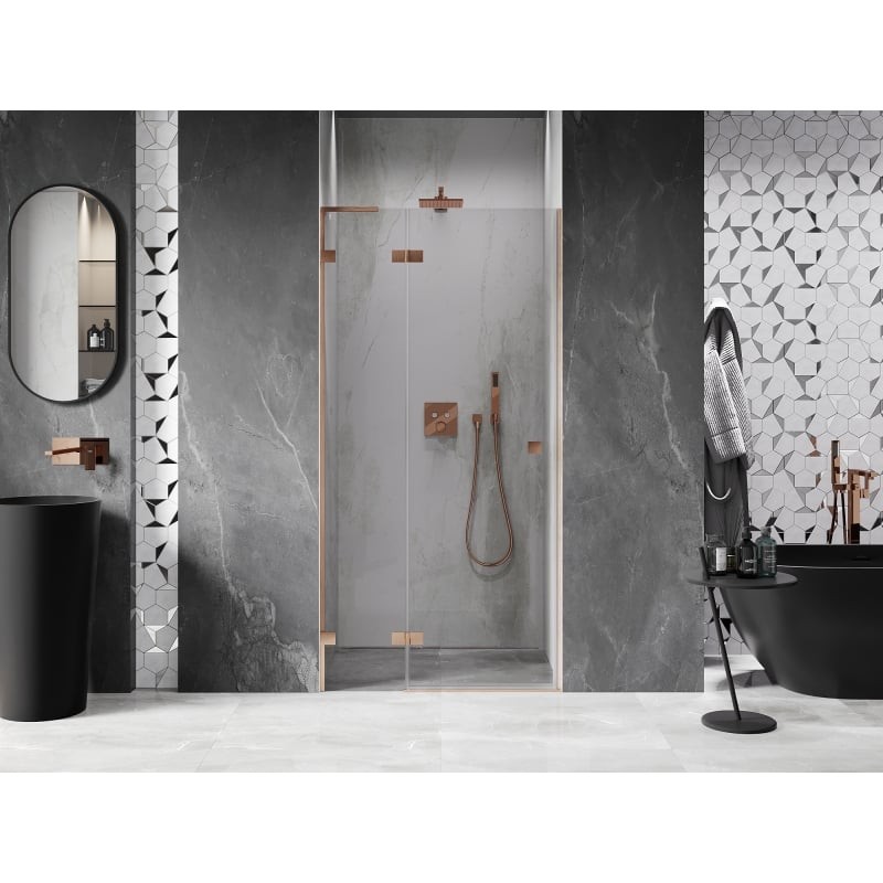 Specifikace produktu: Rozměr: 70x200 cm Strana montáže: Levá Vchod: Otevíravý Barva skla: Průhledná Povrchová úprava: Kartáčovaná měď Profil: Hliník Stabilizátor ve tvaru L: Nerezová ocel Typ skla: Tvrzené Tloušťka skla: 8 mm Povrchová úprava pro snadné čištění Možnost nastavení šířky Dva montážní systémy: - S profilem, který umožňuje vyrovnání nerovností stěny - Bez profilu pro dokonale rovné stěny Možnost montáže na sprchovou vaničku nebo dlaždice Mechanismus pro zvedání a spouštění dveří Mosazné svorky a panty v jedné rovině se skleněnou tabulí Magnetický proužek a elastomerové těsnění pro odvod vody Hliníkový práh těsnění dveří