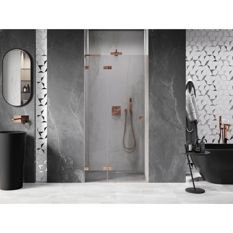 Specifikace produktu: Rozměr: 90x200 cm Strana montáže: Levá Vchod: Otevíravý Barva skla: Průhledná Povrchová úprava: Kartáčovaná měď Profil: Hliník Stabilizátor ve tvaru L: Nerezová ocel Typ skla: Tvrzené Tloušťka skla: 8 mm Povrchová úprava pro snadné čištění Možnost nastavení šířky Dva montážní systémy: - S profilem, který umožňuje vyrovnání nerovností stěny - Bez profilu pro dokonale rovné stěny Možnost montáže na sprchovou vaničku nebo dlaždice Mechanismus pro zvedání a spouštění dveří Mosazné svorky a panty v jedné rovině se skleněnou tabulí Magnetický proužek a elastomerové těsnění pro odvod vody Hliníkový práh těsnění dveří