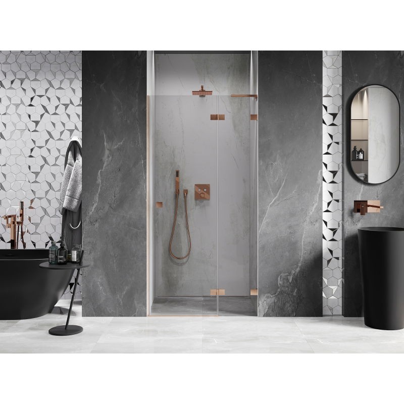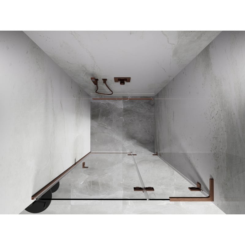 Specifikace produktu: Rozměr: 110x200 cm Strana montáže: Pravá Vchod: Otevíravý Barva skla: Průhledná Povrchová úprava: Kartáčovaná měď Profil: Hliník Stabilizátor ve tvaru L: Nerezová ocel Typ skla: Tvrzené Tloušťka skla: 8 mm Povrchová úprava pro snadné čištění Možnost nastavení šířky Dva montážní systémy: - S profilem, který umožňuje vyrovnání nerovností stěny - Bez profilu pro dokonale rovné stěny Možnost montáže na sprchovou vaničku nebo dlaždice Mechanismus pro zvedání a spouštění dveří Mosazné svorky a panty v jedné rovině se skleněnou tabulí Magnetický proužek a elastomerové těsnění pro odvod vody Hliníkový práh těsnění dveří