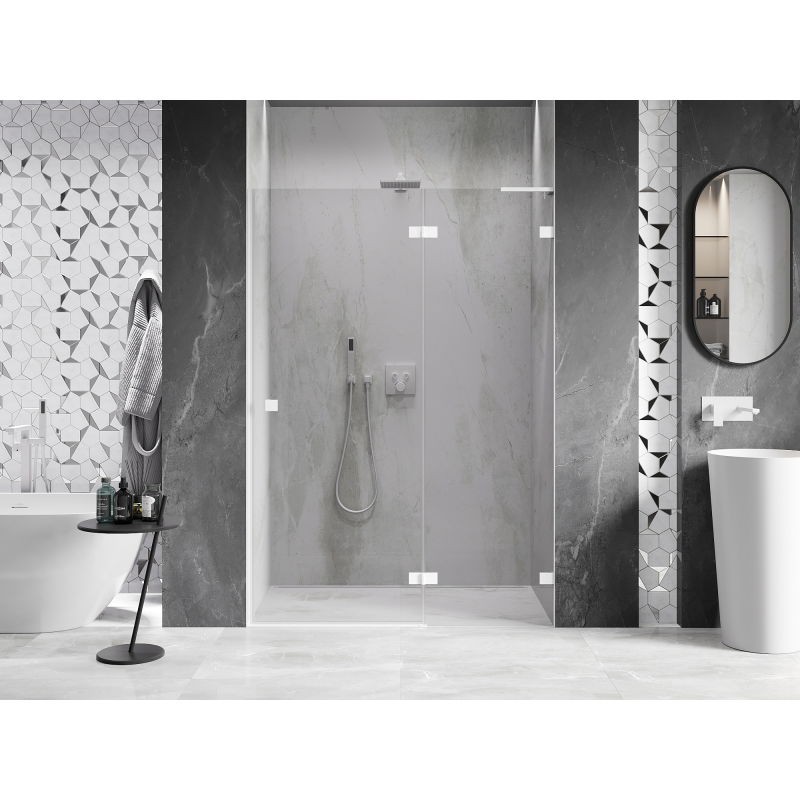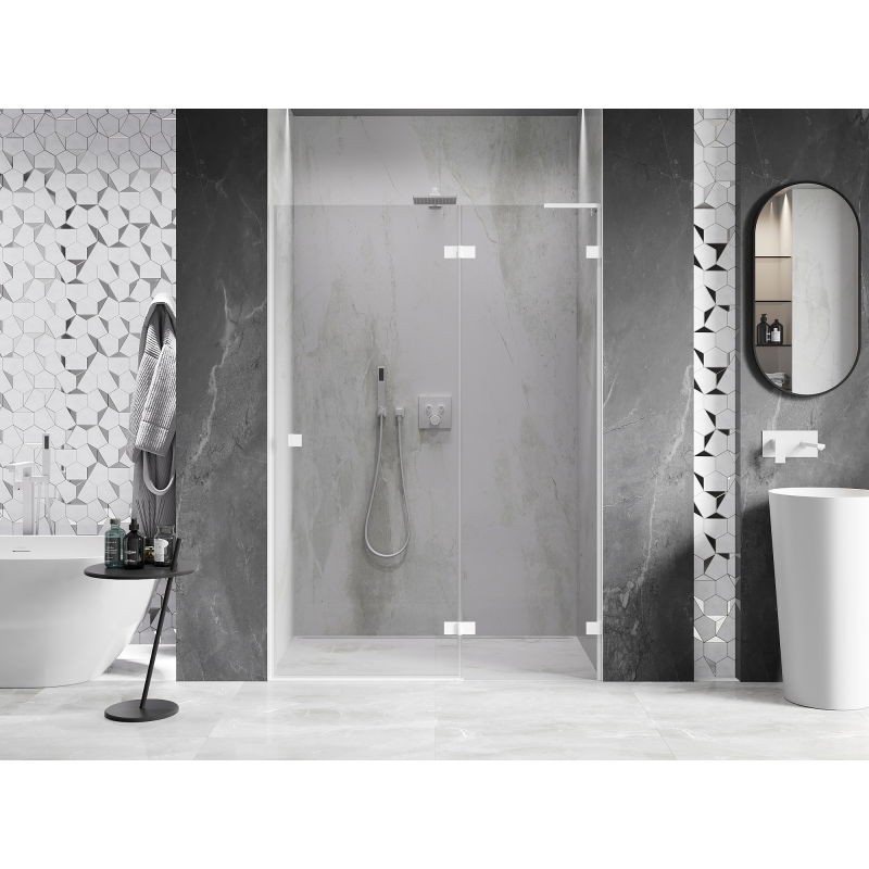 Specifikace produktu: Rozměr: 130x200 cm Strana montáže: Pravá Vchod: Otevíravý Barva skla: Průhledná Povrchová úprava: Bílá Profil: Hliník Stabilizátor ve tvaru L: Nerezová ocel Typ skla: Tvrzené Tloušťka skla: 8 mm Povrchová úprava pro snadné čištění Možnost nastavení šířky Dva montážní systémy: - S profilem, který umožňuje vyrovnání nerovností stěny - Bez profilu pro dokonale rovné stěny Možnost montáže na sprchovou vaničku nebo dlaždice Mechanismus pro zvedání a spouštění dveří Mosazné svorky a panty v jedné rovině se skleněnou tabulí Magnetický proužek a elastomerové těsnění pro odvod vody Hliníkový práh těsnění dveří