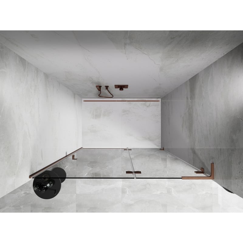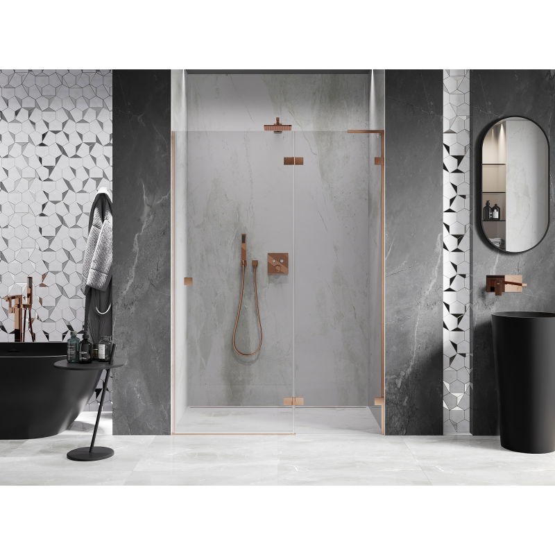Specifikace produktu: Rozměr: 135x200 cm Strana montáže: Pravá Vchod: Otevíravý Barva skla: Průhledná Povrchová úprava: Kartáčovaná měď Profil: Hliník Stabilizátor ve tvaru L: Nerezová ocel Typ skla: Tvrzené Tloušťka skla: 8 mm Povrchová úprava pro snadné čištění Možnost nastavení šířky Dva montážní systémy: - S profilem, který umožňuje vyrovnání nerovností stěny - Bez profilu pro dokonale rovné stěny Možnost montáže na sprchovou vaničku nebo dlaždice Mechanismus pro zvedání a spouštění dveří Mosazné svorky a panty v jedné rovině se skleněnou tabulí Magnetický proužek a elastomerové těsnění pro odvod vody Hliníkový práh těsnění dveří