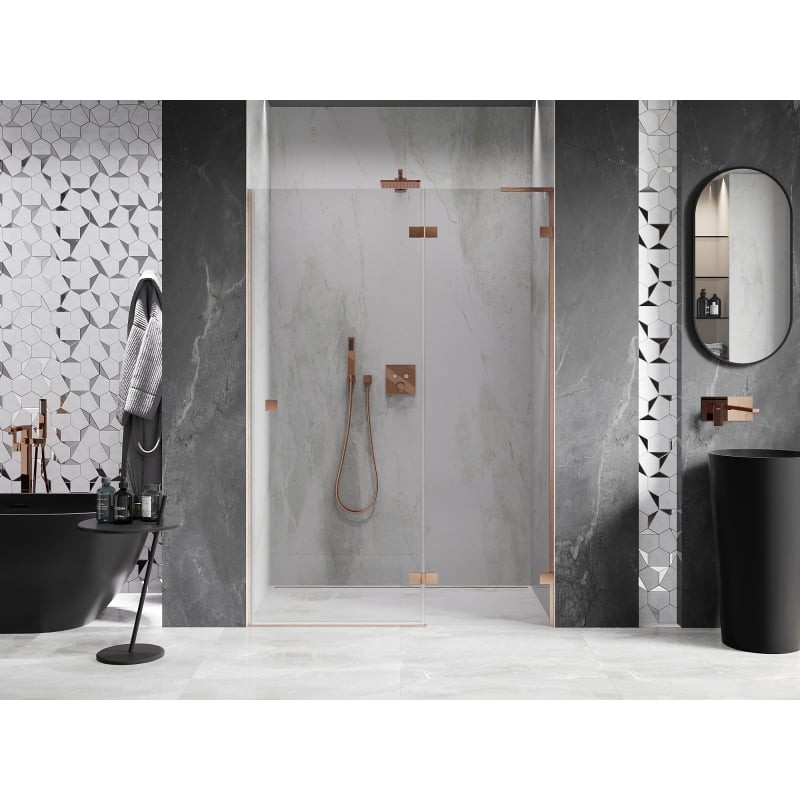 Specifikace produktu: Rozměr: 140x200 cm Strana montáže: Pravá Vchod: Otevíravý Barva skla: Průhledná Povrchová úprava: Kartáčovaná měď Profil: Hliník Stabilizátor ve tvaru L: Nerezová ocel Typ skla: Tvrzené Tloušťka skla: 8 mm Povrchová úprava pro snadné čištění Možnost nastavení šířky Dva montážní systémy: - S profilem, který umožňuje vyrovnání nerovností stěny - Bez profilu pro dokonale rovné stěny Možnost montáže na sprchovou vaničku nebo dlaždice Mechanismus pro zvedání a spouštění dveří Mosazné svorky a panty v jedné rovině se skleněnou tabulí Magnetický proužek a elastomerové těsnění pro odvod vody Hliníkový práh těsnění dveří