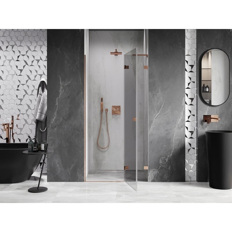 Specifikace produktu: Rozměr: 75x200 cm Strana montáže: Pravá Vchod: Otevíravý Barva skla: Průhledná Povrchová úprava: Růžové zlato Profil: Hliník Stabilizátor ve tvaru L: Nerezová ocel Typ skla: Tvrzené Tloušťka skla: 8 mm Povrchová úprava pro snadné čištění Možnost nastavení šířky Dva montážní systémy: - S profilem, který umožňuje vyrovnání nerovností stěny - Bez profilu pro dokonale rovné stěny Možnost montáže na sprchovou vaničku nebo dlaždice Mechanismus pro zvedání a spouštění dveří Mosazné svorky a panty v jedné rovině se skleněnou tabulí Magnetický proužek a elastomerové těsnění pro odvod vody Hliníkový práh těsnění dveří