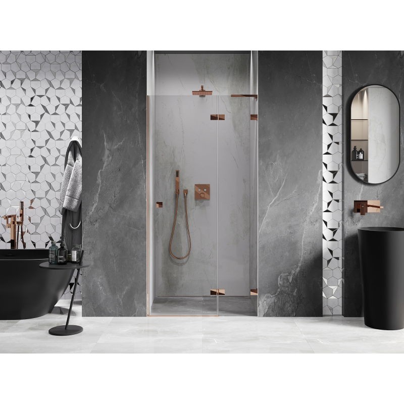 Specifikace produktu: Rozměr: 80x200 cm Strana montáže: Pravá Vchod: Otevíravý Barva skla: Průhledná Povrchová úprava: Růžové zlato Profil: Hliník Stabilizátor ve tvaru L: Nerezová ocel Typ skla: Tvrzené Tloušťka skla: 8 mm Povrchová úprava pro snadné čištění Možnost nastavení šířky Dva montážní systémy: - S profilem, který umožňuje vyrovnání nerovností stěny - Bez profilu pro dokonale rovné stěny Možnost montáže na sprchovou vaničku nebo obklady Mechanismus pro zvedání a spouštění dveří Mosazné svorky a panty v jedné rovině se skleněnou tabulí Magnetický proužek a elastomerové těsnění pro odvod vody Hliníkový práh těsnění dveří
