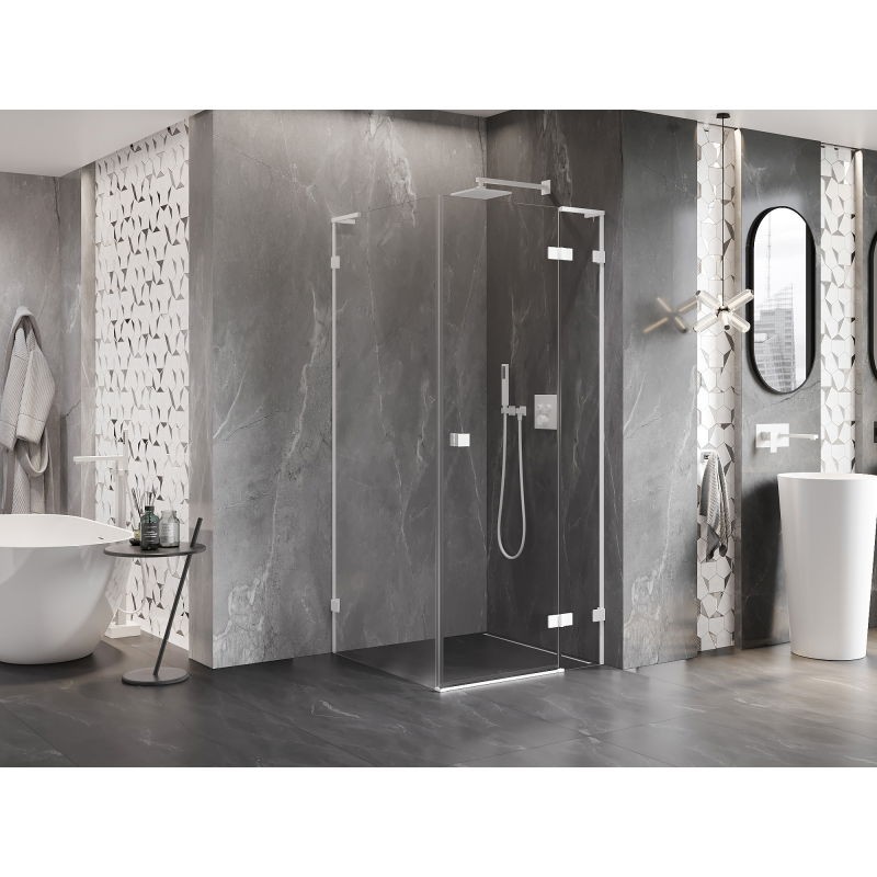 Špecifikácia produktu: Rozmer: 90x90 cm (pravé dvere 90 cm, stena 90 cm) Výška: 200 cm Strana montáže: Pravá Vchod: Dvere s otočnými pántami Farba skla: Priehľadná Povrchová úprava: Biela Profil: Hliník Stabilizátor v tvare L: Nehrdzavejúca oceľ Typ skla: pre jednoduché čistenie Možnosť nastavenia šírky Dva montážne systémy: - s profilom, ktorý umožňuje vyrovnanie nerovností steny - bez profilu v prípade dokonale rovných stien Možnosť montáže na sprchovú vaničku alebo obklady Mechanizmus na zdvíhanie a spúšťanie dverí Mosadzné svorky a pánty v jednej rovine so sklenenou tabuľou Magnetický prúžok a prástomerové tesnenia