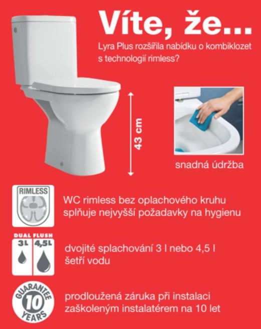 WC kombi RIMLESS / bez splachovacieho kruhu / = je moderný systém splachovania, ktorý sa charakterizuje znamenitou funkčnosťou a vysokou hygienou oproti bežným klozetům so splachovacím kruhom. U bežných klozetov môže dochádzať k zachytávanie nečistôt vo splachovacím kruhu pod okrajom misy. Súčasný systém zaisťuje dokonalý rozvod vody a jednoduché čistenie - všetok priestor vo vnútri misy je smaltovaný a jednoducho čistiteľný.