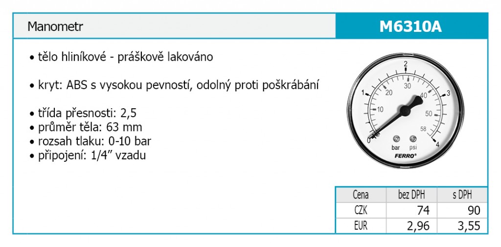 Manometer axiálny• Telo hliníkové - práškovo lakované• Kryt: ABS s vysokou pevnosťou, odolný proti poškriabaniu• trieda presnosti: 2,5• priemer tela: 63 mm• rozsah tlaku: 0-10 bar• pripojenie: 1/4” vzadu