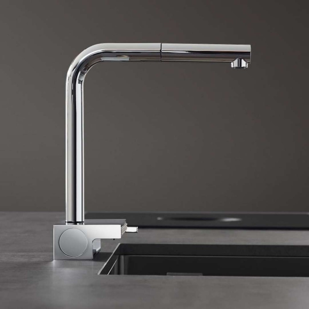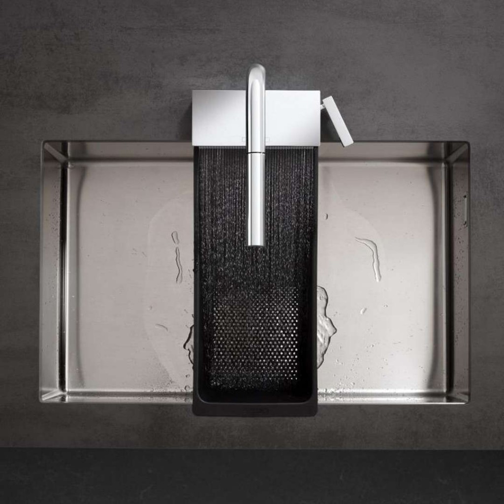 Dizajnová kuchynská batéria sa úplne novým druhom laminárneho sprchového prúdu SatinFlow, ktorý je tvorený 133 samostatnými útly vodnými lúčmi. Tie jemne a účinne obtekajú krehké suroviny, čo umožňuje ich dôkladnejšie a šetrnejšie umývanie. Skvelým riešením je tiež použitie multifunkčného sita, ktoré je navrhnuté tak, aby sa dokonale hodilo pod laminárne prúd kuchynskej batérie.