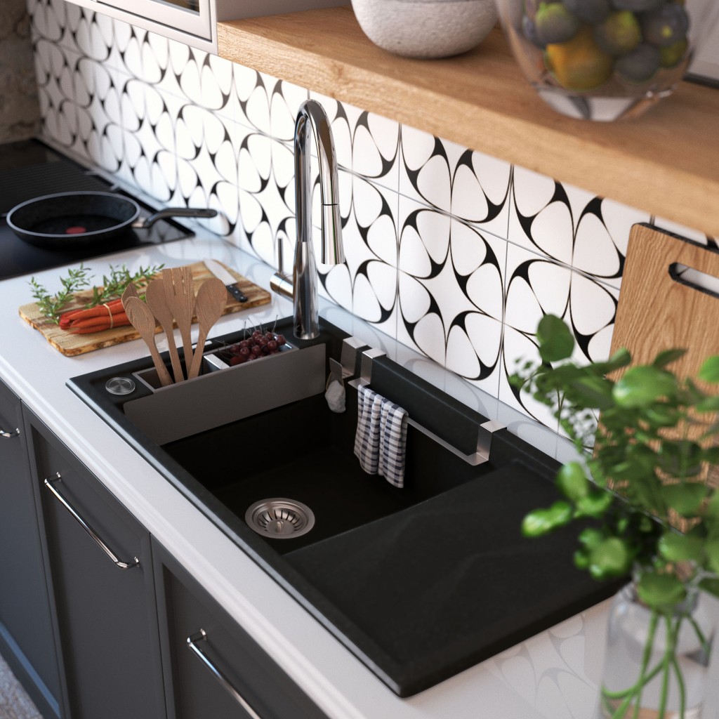 Granitový 1-miskový drez séria Magnetic , je moderný drez s magnetickými vlastnosťami, ktoré sú pre užívateľov na prvý pohľad neviditeľné. Drezy z originálnej kolekcie Magnetic sú vybavené magnetmi , vďaka ktorým je možné na bok misy umiestniť oceľový kryt. Elegantný kryt oddeľuje misu od bočnej police a vytvára ďalší priestor, ktorý zvyšuje funkčnosť drezu a umožňuje ho voliteľne vybaviť vyhradeným príslušenstvom z kolekcie - hygienickými držiakmi na utierku a kuchynskú drôtenku alebo praktickými košíkmi s odkvapkávačom. Drez zapustený do dosky má priestrannú misu a krátky odkvapkávač zaujme ozdobným motívom rybej kosti, ktorý urýchľuje odtok vody.