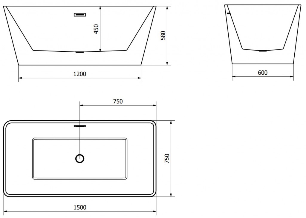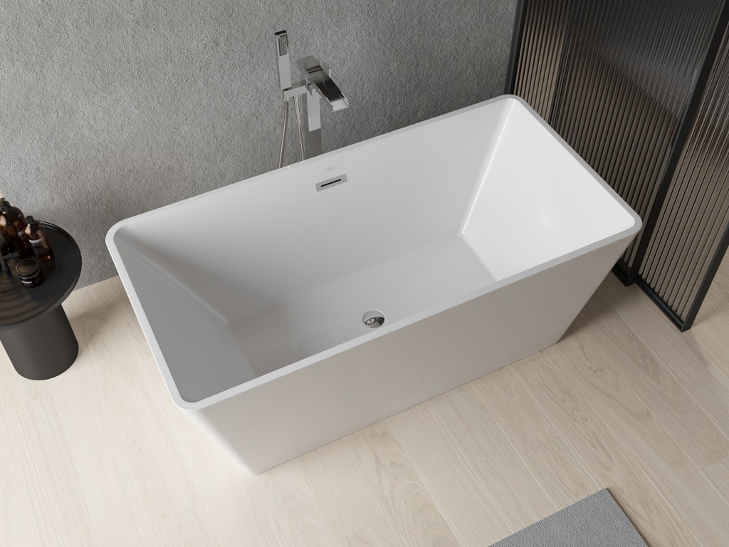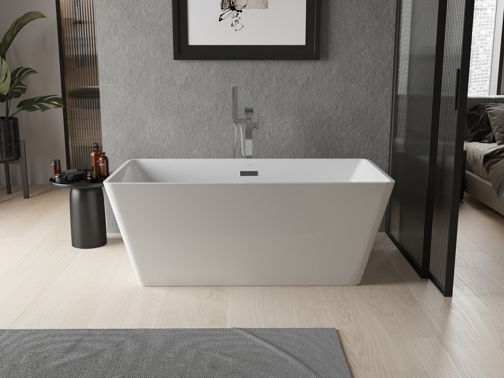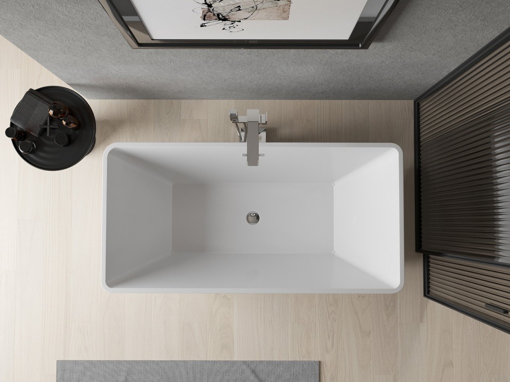 Voľne stojaca obdĺžniková akrylátová vaňa série MALAGA od výrobcu MEXEN s prepadom a umiestnenom odpade na strede vane. Súčasťou vane je odtoková zátka na sifón.