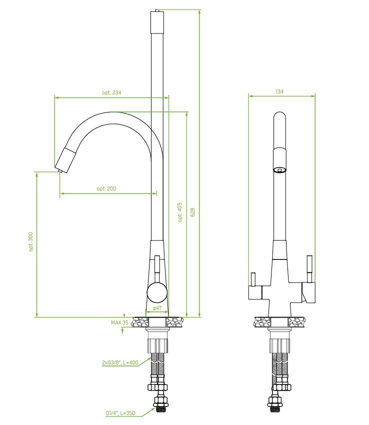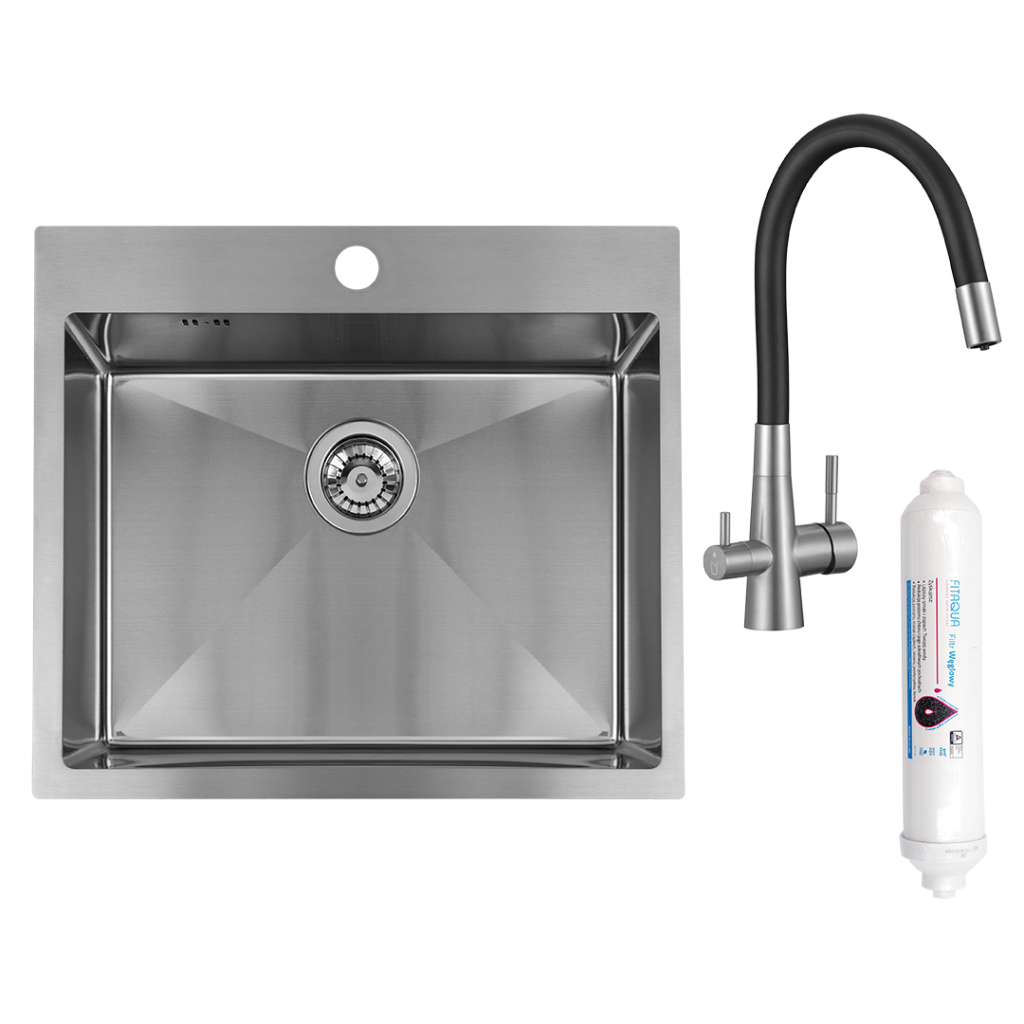 Súčasťou drezu je kuchynská batéria Riveco s uhlíkovým filtrom, ktorá zaisťuje prístup k filtrovanej vode bez nutnosti použitia plastových fliaš. Vďaka dvojitej páke umožňuje ľahké a oddelené ovládanie bežnej a filtrovanej vody, čím prispieva k pohodliu aj ekologickej prevádzke v kuchyni.