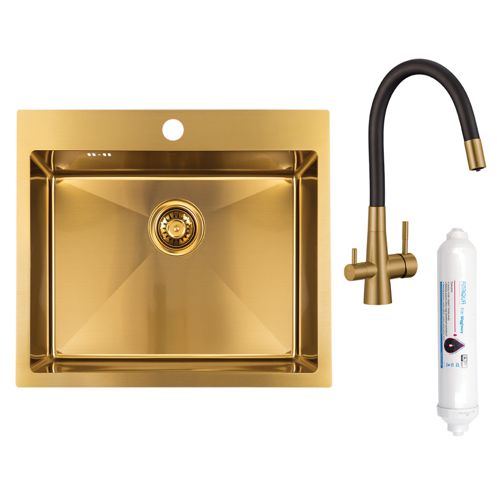 Súčasťou drezu je kuchynská batéria Riveco s uhlíkovým filtrom, ktorá zaisťuje prístup k filtrovanej vode bez nutnosti použitia plastových fliaš. Vďaka dvojitej páke umožňuje ľahké a oddelené ovládanie bežnej a filtrovanej vody, čím prispieva k pohodliu aj ekologickej prevádzke v kuchyni.