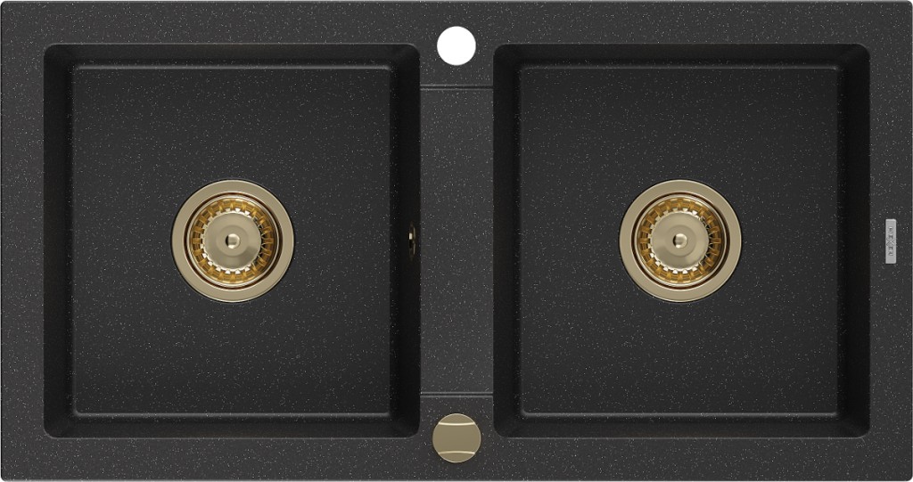 MEXEN/S - Mario granitový drez 2-bowl 820x436 mm, čierny/striebro metalík + zlatý sifón (6504822000-73-G)