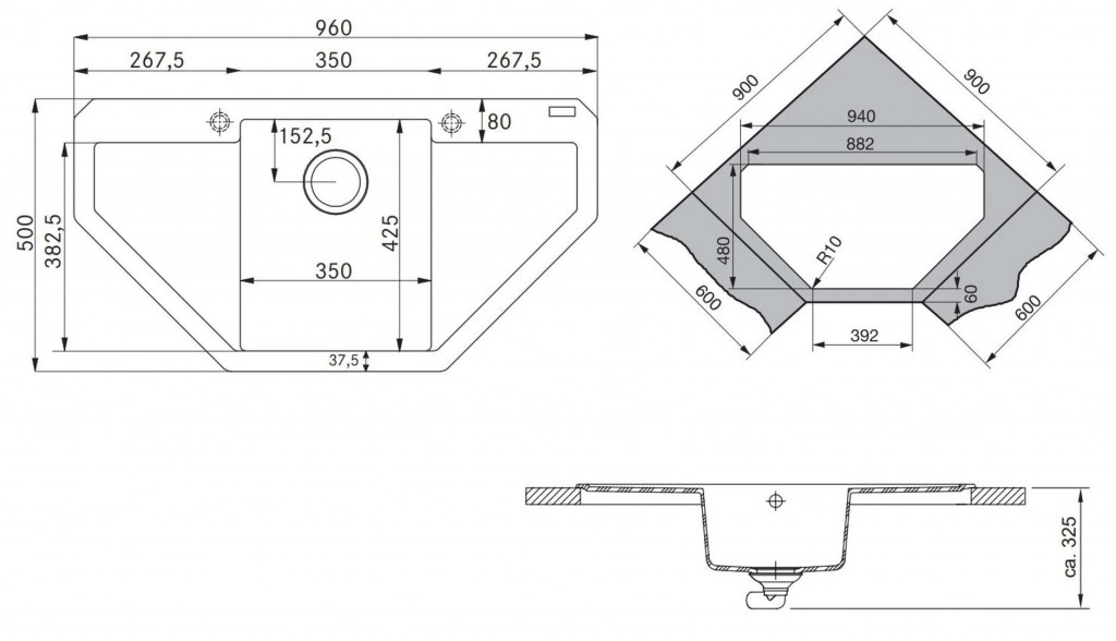 Fragranitový drez MRG 612 E materiál: Fragranit + povrchová úprava: Sanitized vhodný pre inštaláciu do rohu pre horný montáž rozmery: 960 × 500 mm výrez: podľa šablóny (v balení) drez: 350 × 425 × 200 mm spodná skrinka rohová 900 x 900 mm, alebo 105… (celý popis)