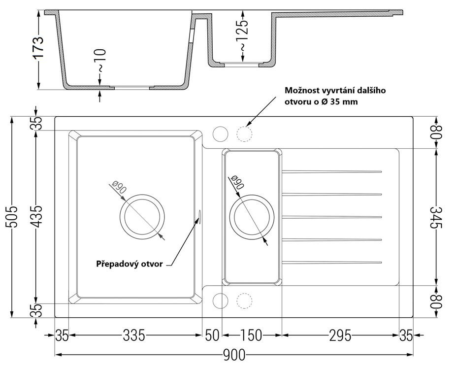 - odtokový otvor: 3,5 ”; fi = 90 mm
