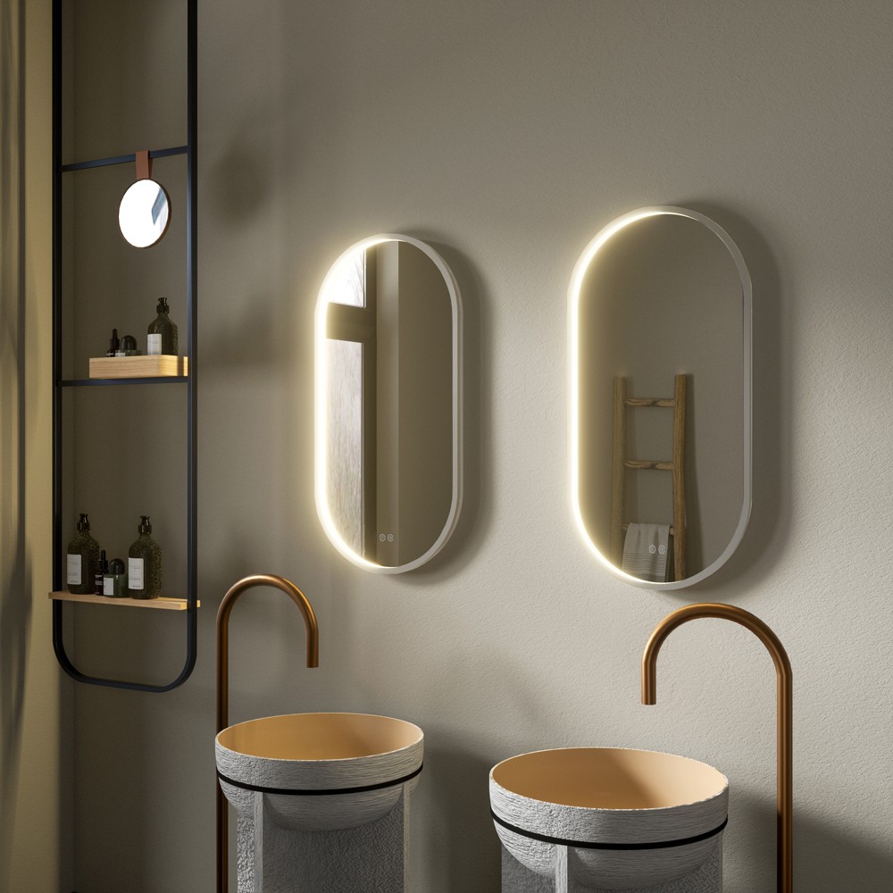 Elegantné zrkadlo s LED osvetlením. Zrkadlo sa spúšťa dotykovým senzorom umiestneným so spodnou prednou časťou zrkadla. Zrkadlo je vybavené úchytmi (závesy aj vhodné háčiky na stenu) na zvislé zavesenie. Pri zrkadlách s osvetlením odporúčame vývod elektriny umiestniť "na stred zrkadla". Dĺžka prívodného kábla je 0,8 m umožňuje pohodlnú montáž.