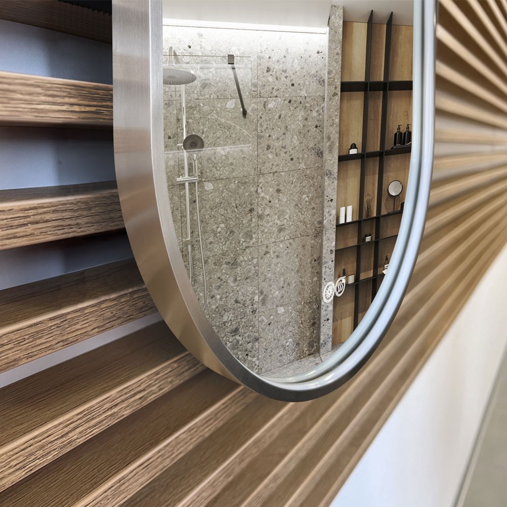 Zrkadlá s LED osvetlením a funkciou odmrazovania sa automaticky vypnú po hodine prevádzky, čím zabezpečujú úsporu energie a prispievajú k bezpečnosti.