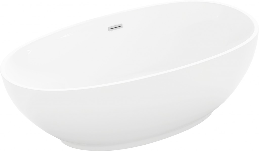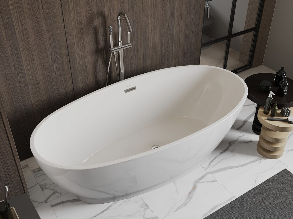Voľne stojaca oválna akrylátová vaňa série BILBAO od výrobcu MEXEN s prepadom a umiestnenom odpade na strede vane.