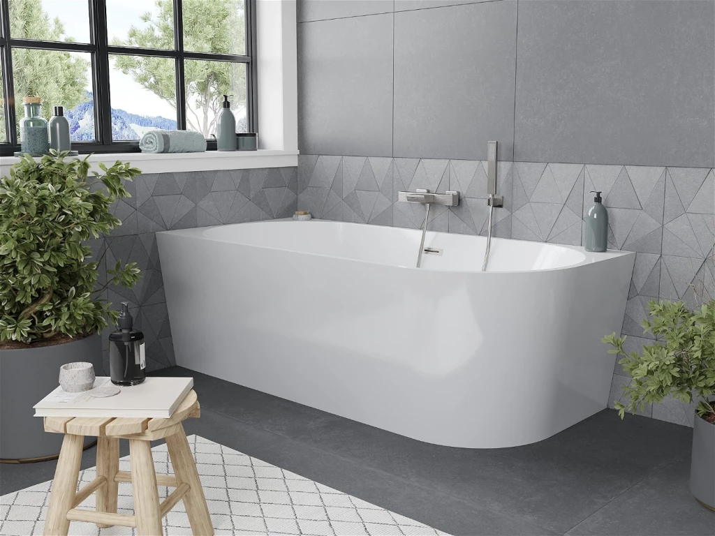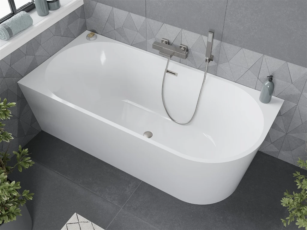 Voľne stojaca rohová vaňa MIA je určená na umiestnenie k stene. Je to často luxusný a dizajnový prvok, ktorý prináša do kúpeľne elegantný a moderný vzhľad. Voľne stojace vane sú často spájané s luxusnými kúpeľňami a ponúkajú jedinečný zážitok z kúpania.