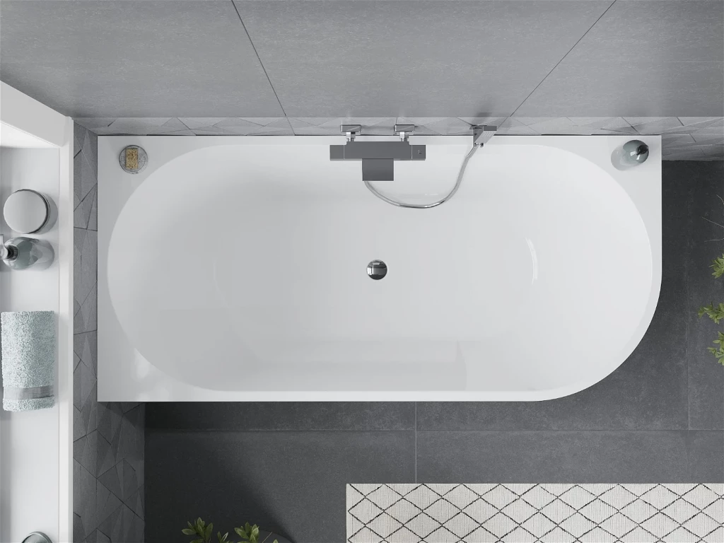 Voľne stojaca rohová vaňa MIA je určená na umiestnenie k stene. Je to často luxusný a dizajnový prvok, ktorý prináša do kúpeľne elegantný a moderný vzhľad. Voľne stojace vane sú často spájané s luxusnými kúpeľňami a ponúkajú jedinečný zážitok z kúpania.