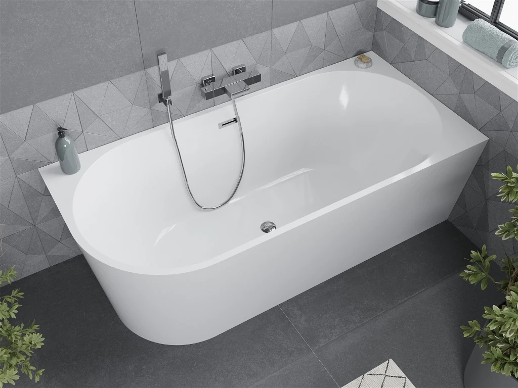 Voľne stojaca rohová vaňa MIA je určená na umiestnenie k stene. Je to často luxusný a dizajnový prvok, ktorý prináša do kúpeľne elegantný a moderný vzhľad. Voľne stojace vane sú často spájané s luxusnými kúpeľňami a ponúkajú jedinečný zážitok z kúpania.
