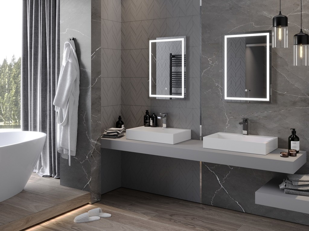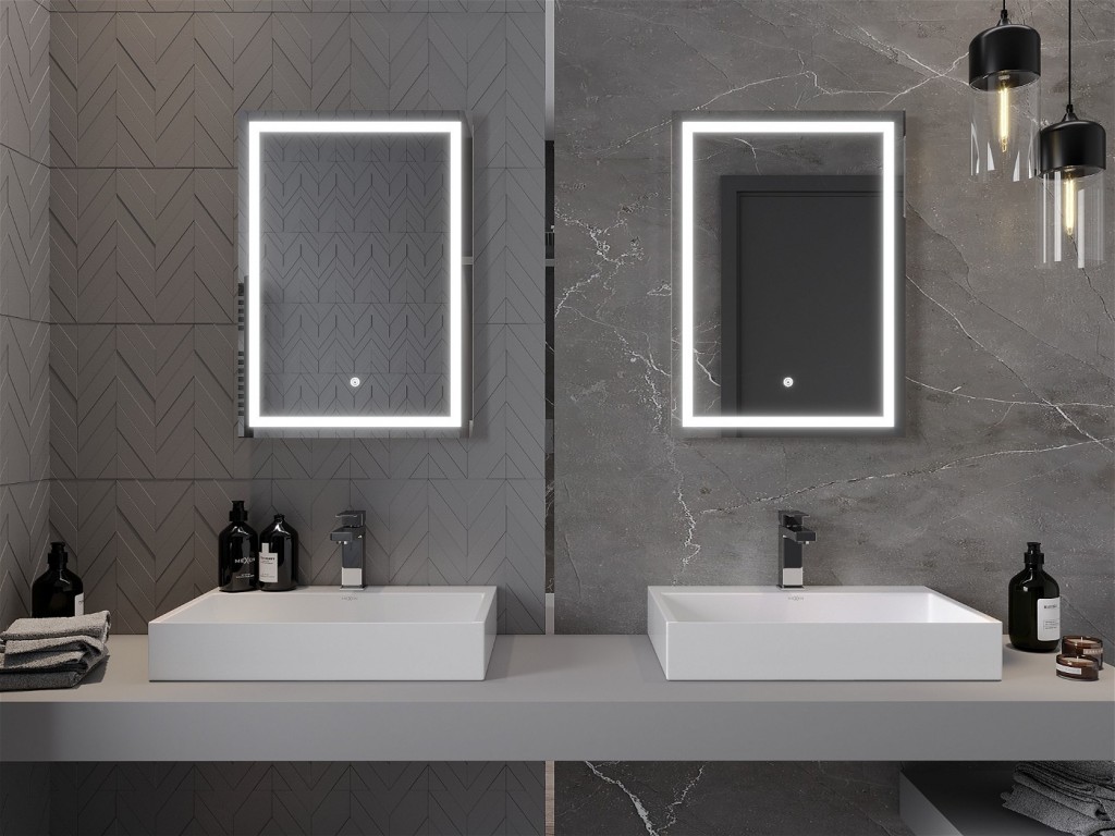 Moderné a jednoduché zrkadlo kolekcie MIKO, je vybavené LED podsvietením, ktoré sa ľahko ovláda pomocou dotykového tlačidla priamo na ploche zrkadla . Zrkadlo je vybavené vyhrievacou podložkou ANTI-CAR , ktorá eliminuje zahmlenie skla.
