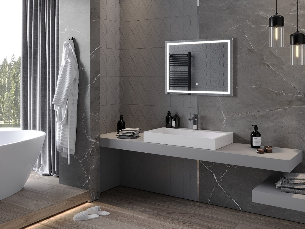 Moderné a jednoduché zrkadlo kolekcie MIKO, je vybavené LED podsvietením, ktoré sa ľahko ovláda pomocou dotykového tlačidla priamo na ploche zrkadla . Zrkadlo je vybavené vyhrievacou podložkou ANTI-CAR , ktorá eliminuje zahmlenie skla.