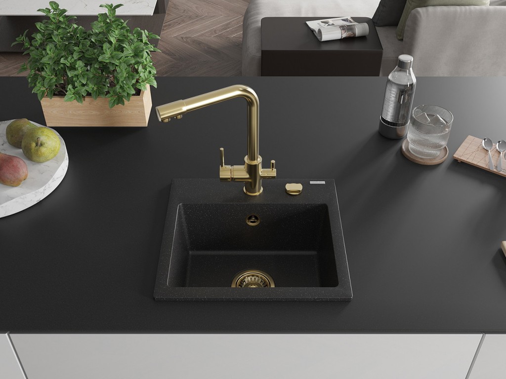 Technické dáta: drez: Rozmer: 435x410x171mm Hĺbka komory: 161 mm Rozmery komory: 375x280 mm Priemer odtoku: ø90 mm Typ: 1-komorový Typ: Zapustené do pracovnej dosky Farba: čierna/strieborná metalíza Povrchová úprava sifónu: zlatá Materiál: žula (80%… (celý popis)