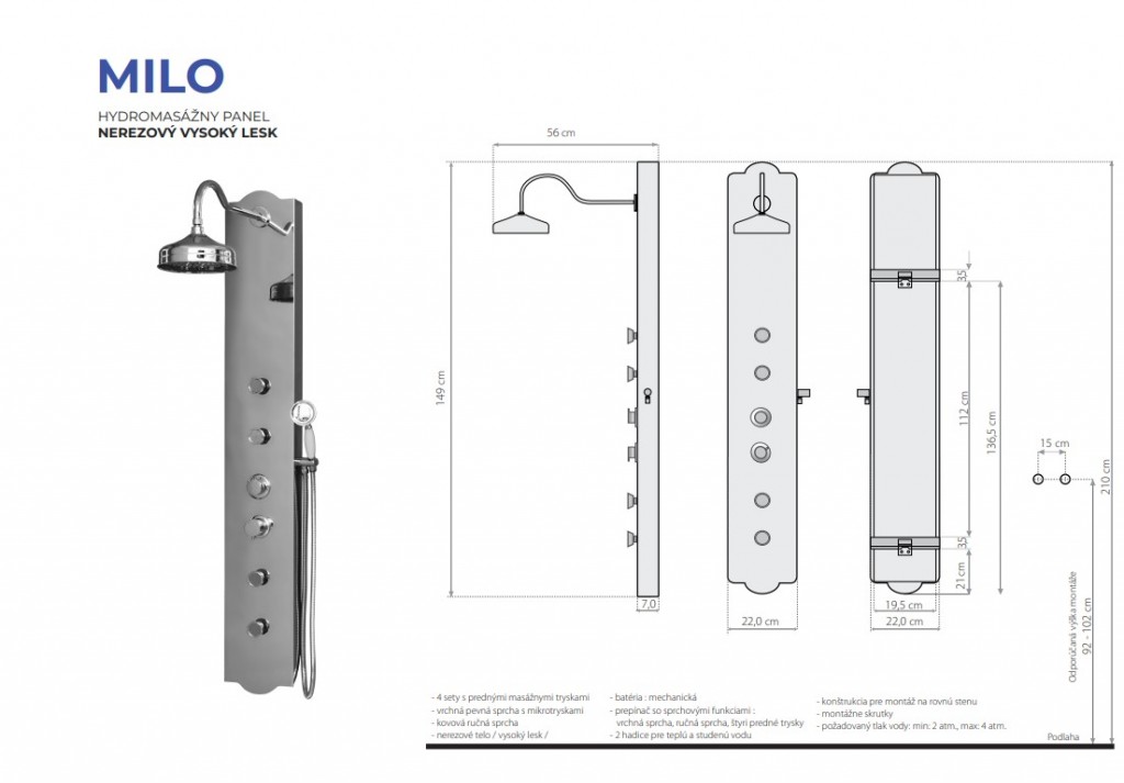 Aj prostredníctvom hydromasážneho panelu MILO vytvoríte luxusný sprchovací priestor. Hydromasážne sprchové panely majú vrchnú sprchu, ktorá je pevná a spodnú sprchu, ktorá je spojená s panelom chrómovou flexibilnou hadicou a trysky. Funkcie panelu sa programujú pomocou regulátora. Silnejším pootočením sa otvára a zatvára prívod vody, slabším pootočením sa menia jednotlivé funkcie. Na montáž nepotrebujete žiadne špeciálne zariadenia. Jednoducho ho pripojíte flexibilnými hadicami na prívod teplej a studenej vody.