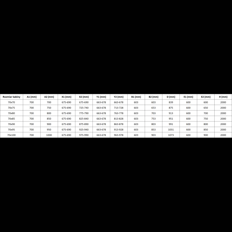 Špecifikácia produktu: Rozmer: 70x70 cm Výška: 200 cm Strana montáže: Univerzálny Vchod: Dvere s výklopnými krídlami Farba skla: Priehľadná Povrchová úprava: Čierna Profil: Hliník Typ skla: Tvrdené Hrúbka skla: 6 mm Povrchová úprava pre ľahké čistenie Nastaviteľná Mechanizmus zdvíhania a spúšťania dverí Magnetický prúžok a elastomérové tesnenie pre odtok vody Hliníkový prah tesnenia dverí
