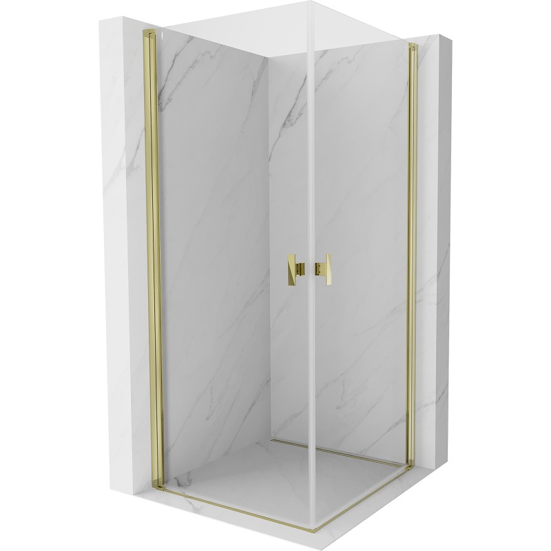 Špecifikácia produktu: Rozmer: 80x80 cm Výška: 200 cm Strana montáže: Univerzálny Vchod: Dvere s výklopnými krídlami Farba skla: Priehľadná Povrchová úprava: Zlatá Profil: Hliník Typ skla: Tvrdené Hrúbka skla: 6 mm Povrchová úprava pre ľahké čistenie Nastaviteľná Mechanizmus zdvíhania a spúšťania dverí Magnetický prúžok a elastomérové tesnenie pre odtok vody Hliníkový prah tesnenia dverí