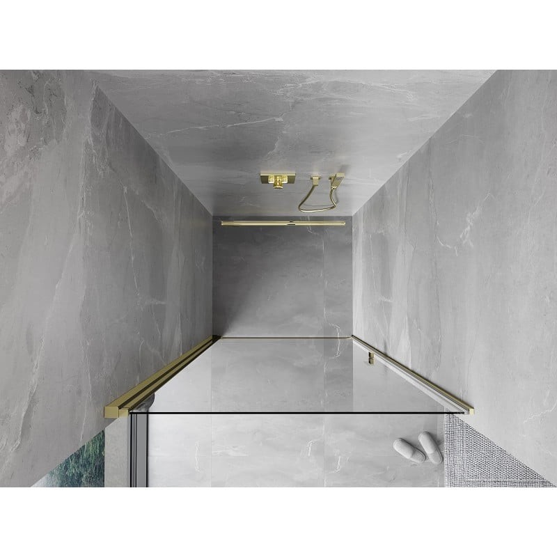 Špecifikácia produktu: Rozmer: 90x200 cm Strana montáže: Univerzálny Vchod: Výklopný Farba skla: Priehľadná Povrchová úprava: Zlatá Profil: Hliník Typ skla: Tvrdené Hrúbka skla: 6 mm Povrchová úprava pre ľahké čistenie Nastaviteľná šírka Možnosť montáže na sprchovaciu vaničku alebo mus prúžok a elastomérové tesnenie pre odtok vody Hliníkový prah tesnenia dverí