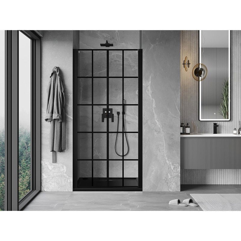 Špecifikácia produktu: Rozmer: 95x200 cm Strana montáže: Univerzálny Vchod: Výklopný Farba skla: Čierna mriežka Povrchová úprava: Čierna Profil: Hliník Typ skla: Tvrdené Hrúbka skla: 6 mm Povrchová úprava pre ľahké čistenie Nastaviteľná šírka Možnosť inštalácie na sprchovú vaničku Magnetický prúžok a elastomérové tesnenie pre odtok vody Hliníkový prah tesnenia dverí