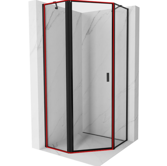 Dveřní část MIST (pevná stěna + křídlové dveře) je vyrobena z 6mm čirého tvrzeného skla s černým dekorativním okrajem v elegantním černém provedení.