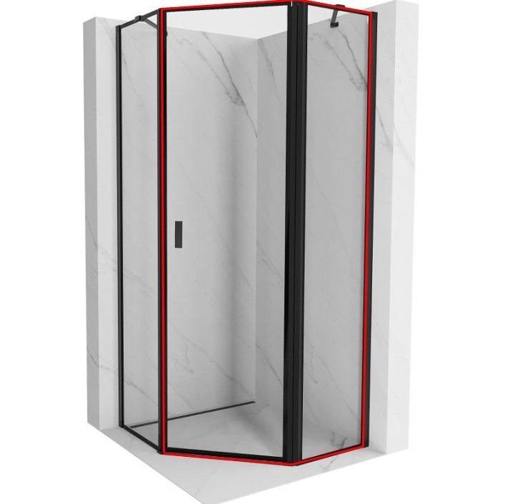 Dveřní část MIST (pevná stěna + křídlové dveře) je vyrobena z 6mm čirého tvrzeného skla s černým dekorativním okrajem v elegantním černém provedení.
