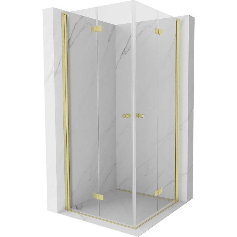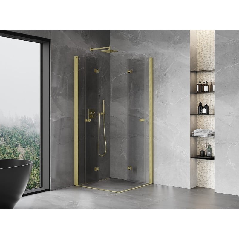 Špecifikácia produktu: Rozmer: 90x90 cm (ľavé dvere 90 cm, pravé dvere 90 cm) Výška: 200 cm Strana montáže: Univerzálny Vchod: Skladacie dvere Farba skla: Priehľadná Povrchová úprava: Kartáčované zlato Profil: Hliník Typ skla: Tvrdené Hrúbka skla: 6 inštalácia na sprchovú vaničku alebo obklad Mechanizmus na zdvíhanie a spúšťanie dverí Mosadzné pánty v jednej rovine so sklom Magnetický prúžok a elastomérové tesnenie na odvod vody Hliníkový prah tesnenia dverí