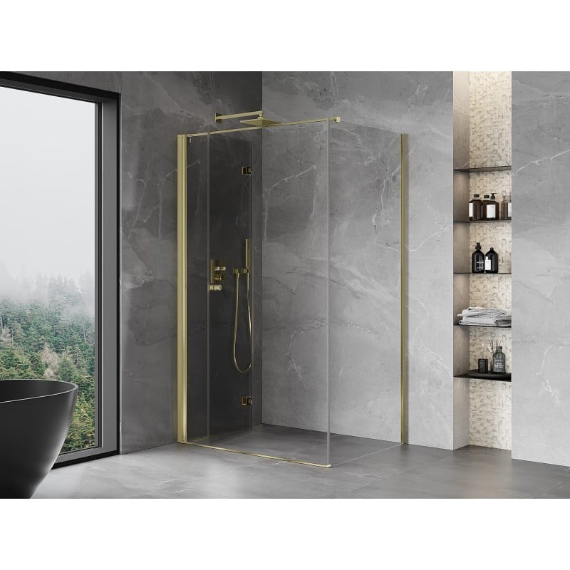 Špecifikácia produktu: Rozmer: 90x70 cm (ľavé dvere 90 cm, stena 70 cm) Výška: 200 cm Strana montáže: Ľavá Vchod: Skladacie dvere Farba skla: Priehľadná Povrchová úprava: Zlatá Profil: Hliník Konzola: Nerezová oceľ Max. dĺžka konzoly: 150 cm Konzolu je možné rezať Typ skla: Tvrdené Hrúbka skla: 6 mm Povrchová úprava pre ľahké čistenie Nastaviteľná šírka Možnosť montáže na sprchovú vaničku alebo dlaždice Mechanizmus pre zdvíhanie a spúšťanie dverí Mosadzné pánty v jednej rovine so sklom Hliníkový prah tesnenia dverí