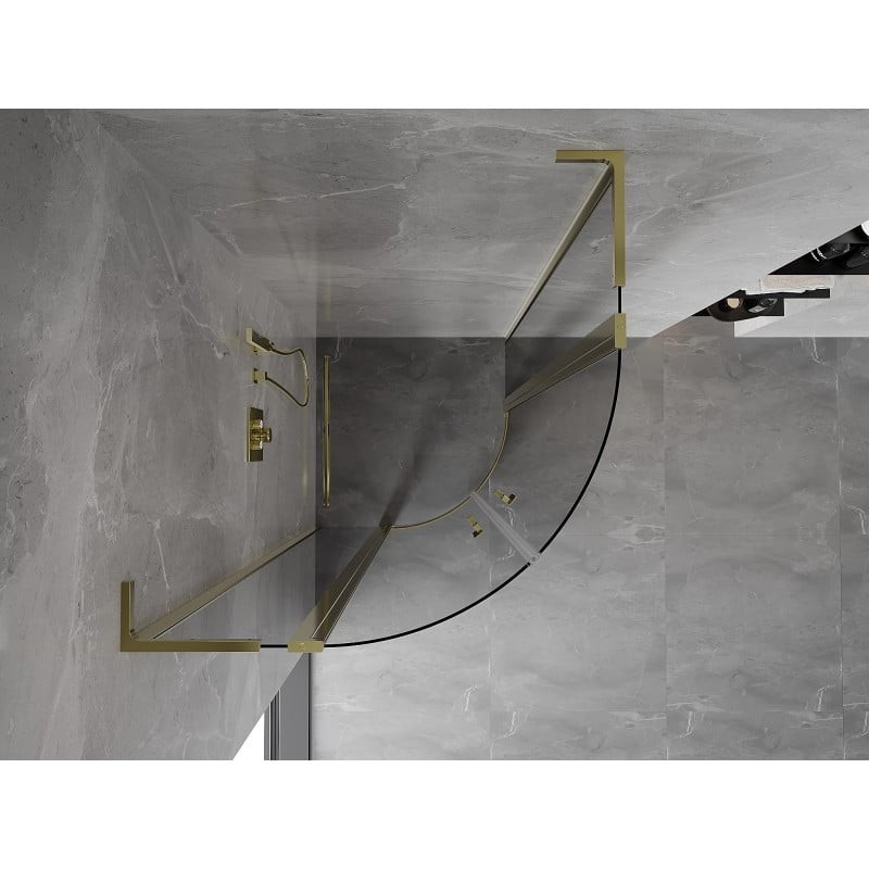 Špecifikácia produktu: Rozmer: 90x90 cm Výška: 200 cm Polomer zakrivenia R55 Strana montáže: Univerzálny Vchod: Dvere s výklopnými krídlami Farba skla: Priehľadná Povrchová úprava: Zlatá Profil: Hliník Uhlový stabilizátor L: Nehrdzavejúca oceľ Typ skla: Tvrdenie Nastaviteľná šírka Možnosť inštalácie na sprchovú vaničku alebo dlaždice Mechanizmus na zdvíhanie a spúšťanie dverí Magnetický prúžok a elastomérové tesnenie na odtok vody Hliníkový prah tesnenia dverí