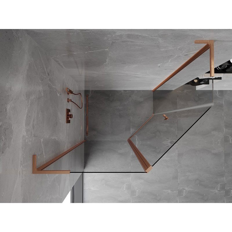 Špecifikácia produktu: Rozmer: 100x80 cm (dvere 100 cm, stena 80 cm) Výška: 200 cm Strana montáže: Univerzálny Vchod: Dvere s otočnými pántami Farba skla: Priehľadná Povrchová úprava: Kartáčovaná meď Profil: Hliník Stabilizátor v tvare L: Nerezová oceľ Povrchová úprava pre ľahké čistenie Nastaviteľná šírka Možnosť inštalácie na sprchovú vaničku alebo dlaždice Mechanizmus pre zdvíhanie a spúšťanie dverí Magnetický prúžok a elastomérové tesnenie pre odtok vody Hliníkový prah tesnenia dverí